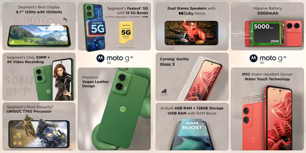 The Moto G35 is Motorola’s new budget 5G smartphone designed for everyday users who want a bright display, smooth performance, and long battery life without spending too much. It continues the brand’s promise of clean Android and reliable performance in the affordable segment.